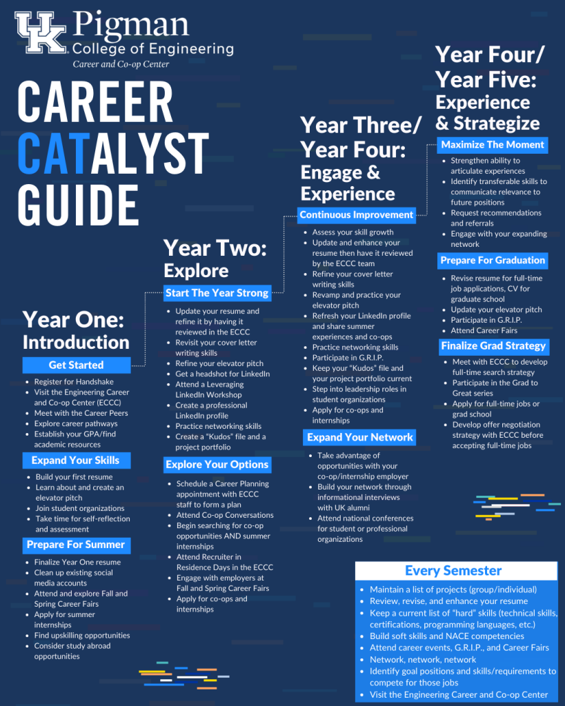 We believe it is vital to take ownership of your career success journey from the moment you first set foot on campus! Acclimating to engineering or computer science studies is a huge task and being told you also need to begin your career success journey can seem overwhelming. Planning out your time at UK doesn’t have to be overwhelming and we’ve put together a guide with year by year instructions to serve as a career development or career CATalyst map.