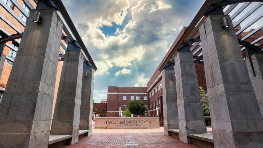 - Continue past RGAN. As you pass RGAN veer left into the Engineering Courtyard. (Look for the large Stanley and Karen Pigman College of Engineering sign in the courtyard just beyond the arches.)